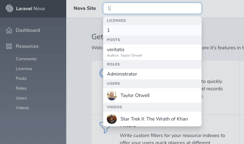 Nova also includes a beautiful global search component which can search across all of your resource types at warp speed: